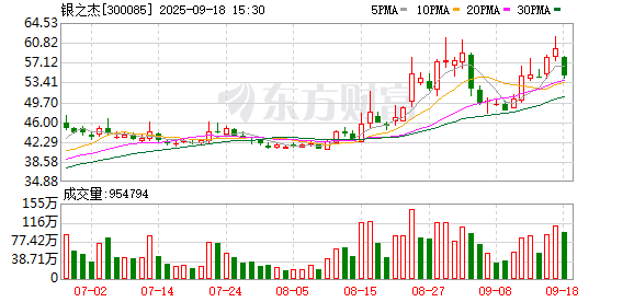 银之杰9月18日大宗交易平台出现一笔成交,成交量99.61万股,成交金额5435.72万元,大宗交易成交价为54.57元。该笔交易的买方营业部为机构专用,卖方营业部为华泰证券股份有限公司上海分公司。
