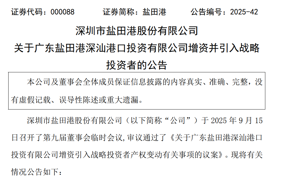 深圳市盐田港股份有限公司(以下简称“盐田港”或“公司”)9月16日发布关于广东盐田港深汕港口投资有限公司增资并引入战略投资者的公告。