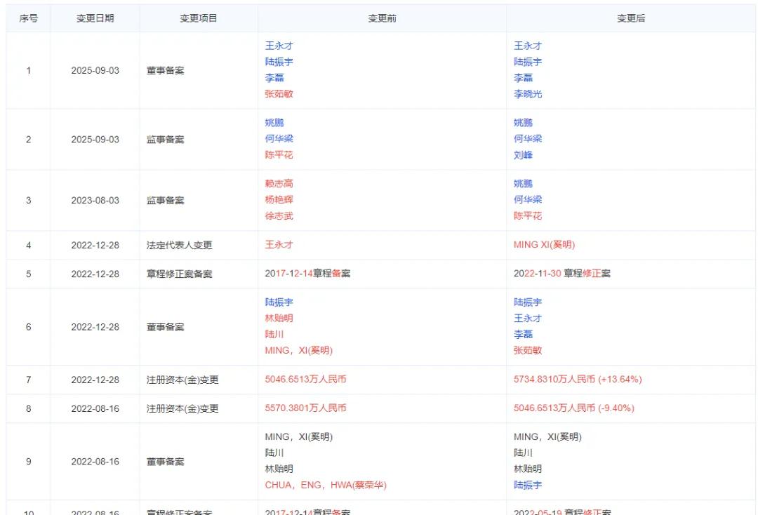 董事备案显示,变更前的董事有王永才、陆振宇、李磊和张茹敏,变更后的董事为王永才、陆振宇、李磊和李晓光。这意味着张茹敏或已卸任董事一职。