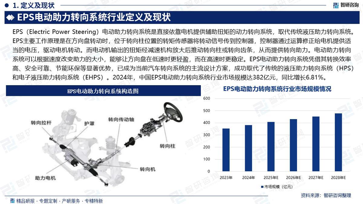 EPS(Electric Power Steering)电动助力转向系统是一种依靠电机提供辅助扭矩的动力转向系统,取代了传统的液压助力转向系统。其工作原理是通过转矩传感器将方向盘转动信号传至控制器,控制器运算后驱动电机转动,经减速机构放大后推动转向柱或齿条,提供转向助力。EPS能根据车速改变助力大小,使方向盘在低速时更轻盈、高速时更稳定。EPS分为C-EPS、P-EPS、DP-EPS和R-EPS四种,其中R-EPS因传动效率高、响应快、操控性能优,成为产品升级的主要方向。2024年,中国EPS电动助力转向系统行业市场规模达382亿元,同比增长6.81%。