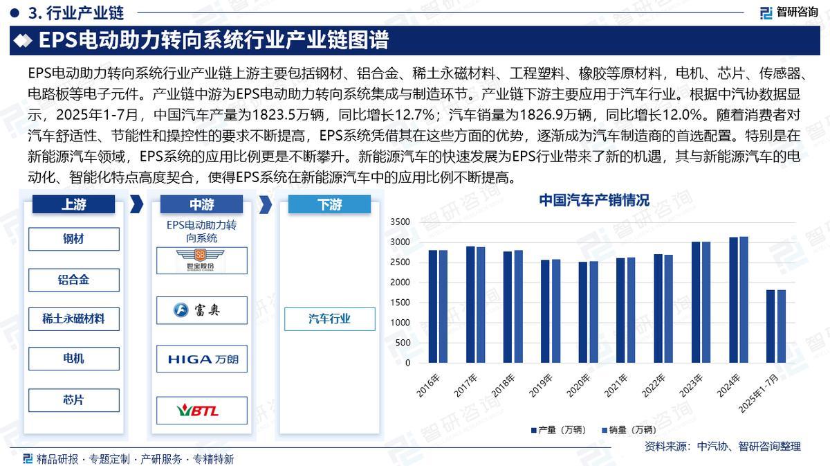 产业链核心节点:根据中汽协数据显示,2025年1-7月,中国汽车产量为1823.5万辆,同比增长12.7%;汽车销量为1826.9万辆,同比增长12.0%。随着消费者对汽车舒适性、节能性和操控性的要求不断提高,EPS系统凭借其在这些方面的优势,逐渐成为汽车制造商的首选配置。特别是在新能源汽车领域,EPS系统的应用比例更是不断攀升。新能源汽车的快速发展为EPS行业带来了新的机遇,其与新能源汽车的电动化、智能化特点高度契合,使得EPS系统在新能源汽车中的应用比例不断提高。