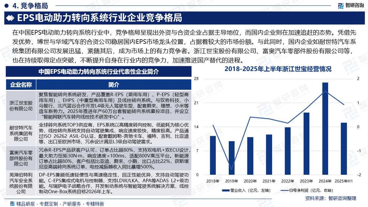 竞争情况:在中国EPS电动助力转向系统行业中,竞争格局呈现出外资与合资企业占据主导地位,而国内企业则在加速追赶的态势。凭借先发优势,博世与华域汽车的合资公司稳居国内EPS市场龙头位置,占据着较大的市场份额。与此同时,国内企业如耐世特汽车系统集团有限公司发展迅猛,紧随其后,成为市场上的有力竞争者。浙江世宝股份有限公司、富奥汽车零部件股份有限公司等,也在持续取得定点突破,不断提升自身在行业内的竞争力,加速推进国产替代的进程。