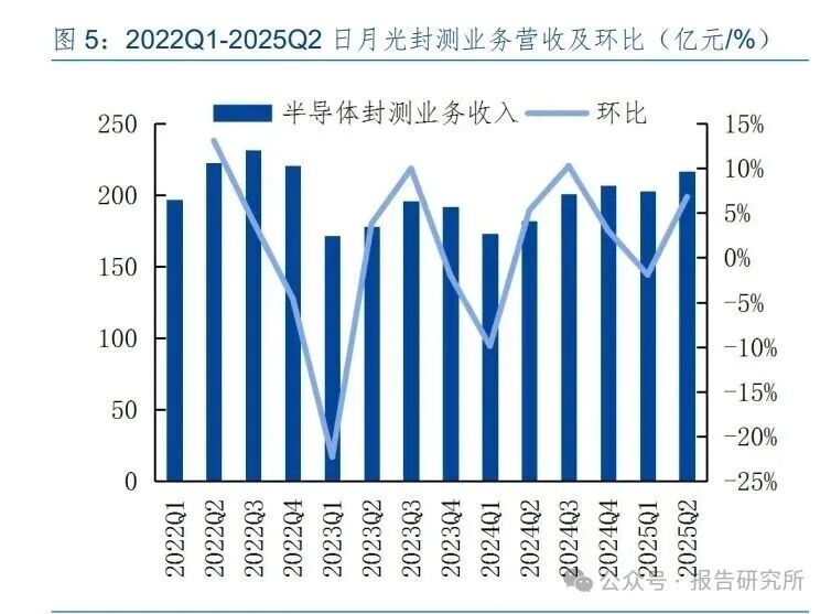 为头部客户提供批量生产的高密度扇出型封装产品,2.5D 等先进封装技术存在切入汽车领域可能性。根据安靠官网数据,2025Q2 公司营收为 107.79 亿元(先进产品87.60亿元,主流产品 20.19 亿元),环比增长 14.30%,同比增长 3.42%,增长高于预期,且所有终端市场均实现两位数环比增长,毛利率为 12%。(1)通信终端市场:受iOS 生态系统推动,通信领域营收环比增长 15%。安卓领域营收环比持平,同比增长 7%。得益于下一代高端智能手机的推出,安靠预计第三季度业绩将表现强劲。随着人工智能向边缘设备拓展,安靠正与主要客户密切合作,评估未来设备需求,并开发先进的封装解决方案,以支持创新。(2)计算终端市场:受个人计算领域新产品量产及存储业务增长推动,2025Q2 营收环比增长16%,第二季度公司开始为头部客户提供首款大批量生产的高密度扇出型封装产品,除 2.5D 封装外,采用RDL 互联技术的高密度扇出型技术也是推动计算领域增长的关键因素。展望 2025Q3,安靠预计数据中心、基础设施和个人计算领域营收都将实现环比增长。(3)汽车及工业市场:受多家客户先进驾驶辅助系统(ADAS)应用新品推动,汽车和工业市场营收环比增长 11%。在连续八个季度同比下滑后,第二季度迎来拐点,实现 6%的同比增长。安靠汽车领域主要客户表明,其对2.5D等先进封装技术在下一代解决方案中的应用兴趣日益浓厚。安靠预计,2025Q3 汽车及工业市场营收预计实现温和环比增长。(4)消费电子市场:受益于可穿戴设备市场份额的提升以及传统产品需求普遍改善,营收环比增长 16%,安靠预计该领域 2025Q3 营收预计环比持平。