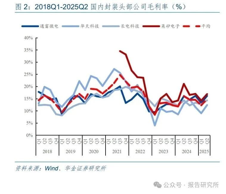 封装板块华天科技自 2025Q2 毛利率环比增长领先,测试板块伟测科技显著高于同业。根据 Wind 数据,2025Q2 对比国内头部封装企业,甬矽电子(毛利率为16.87%)/通富微电(毛利率为 16.12%)毛利率高于封装板块头部公司平均水平(14.92%),2025Q1 毛利率为封装头部公司近三个季度相对低点,2025Q2 头部公司毛利率恢复至2024Q4 毛利率水平附近。根据Wind 数据,近 6 个季度,伟测科技毛利率整体显著高于同业,自2018Q4 开始,测试板块头部公司平均毛利率整体呈下降趋势,2024Q1 伟测科技较其余封测头部企业毛利率率先到达拐点,华岭股份/利扬芯片毛利率于 2024Q4 到达毛利率拐点,出现企稳态势。