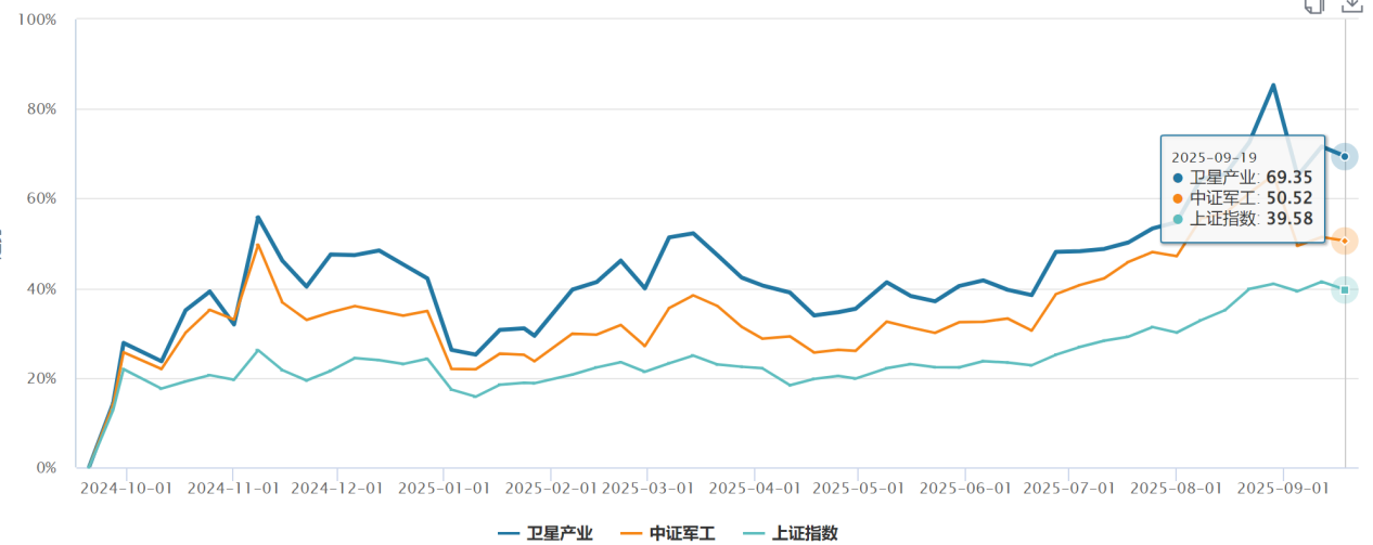 截至最新,中证卫星产业指数近一年已经涨了近70%,不仅跑赢了军工,跟大盘相比超额收益都有30%左右,资金短期获利了结再正常不过。目前市场情绪偏谨慎,加上卫星板块本身换手率不低,资金进进出出也加剧了波动,所以一部分资金流向了防御型板块,对卫星这类高弹性板块形成了一定分流——这可能都是最近一周卫星板块窄幅震荡的原因。