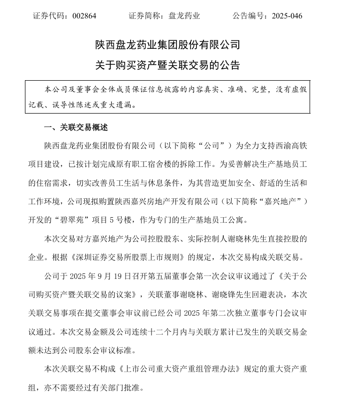 9月19日,盘龙药业发布公告称,公司拟购买嘉兴地产的碧翠苑项目5号楼,作为员工宿舍,交易金额为6689.95万元。交易对方嘉兴地产为公司控股股东、实际控制人谢晓林直接控股的企业,构成关联交易。
