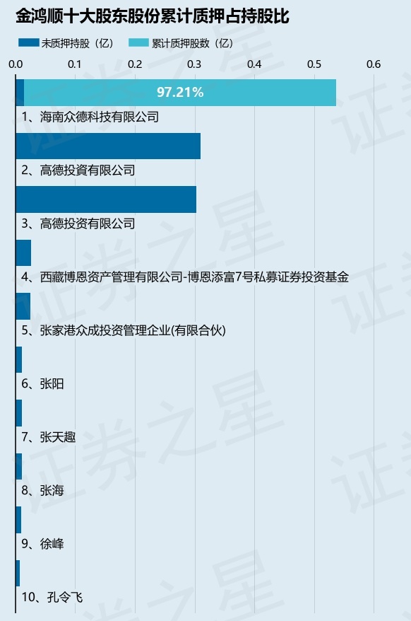 截止本公告日,股东海南众德科技有限公司已累计质押股份5224.1万股,占其持股总数的97.21%。本次质押后金鸿顺十大股东的累计质押股份占持股比例(占持股比例的计算以公司最新一期财务报表公布的十大股东的持股总数为基准)见下图: