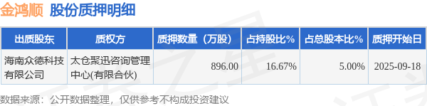 证券之星消息,金鸿顺(603922)9月22日公开信息显示,股东海南众德科技有限公司向太仓聚迅咨询管理中心(有限合伙)合计质押896.0万股,占总股本5.0%。质押详情见下表: