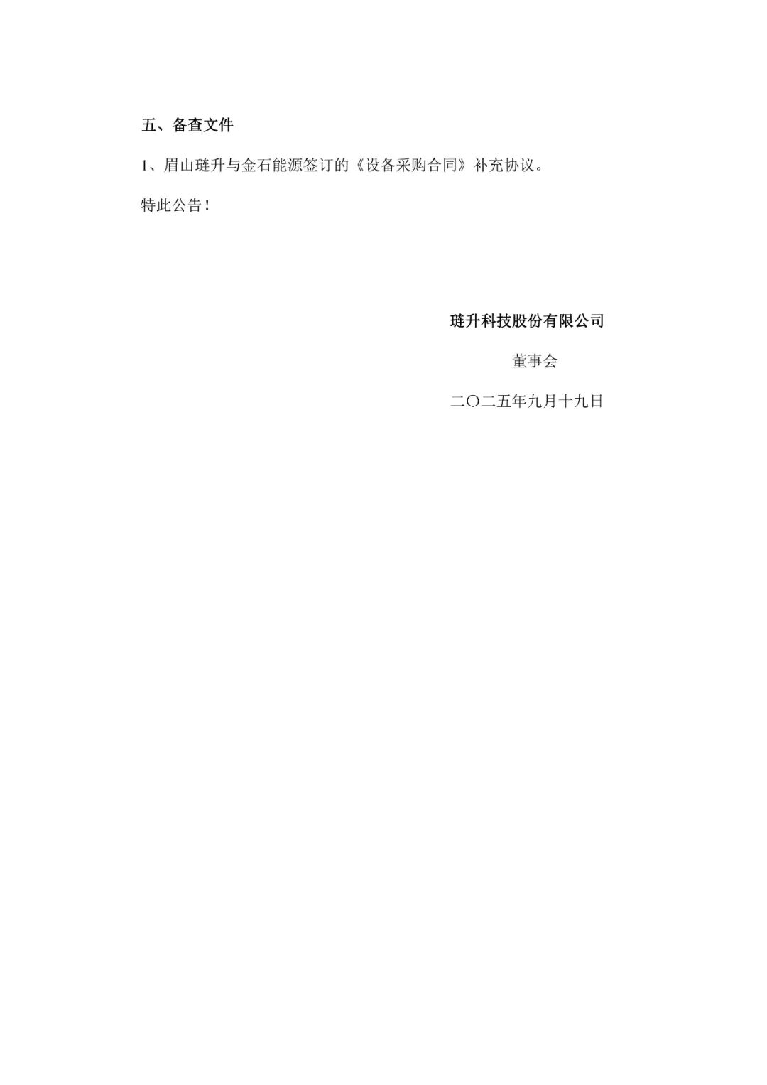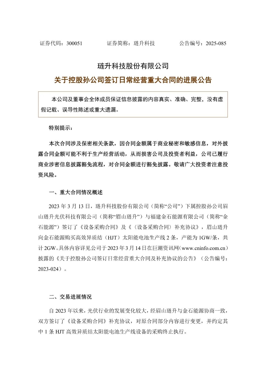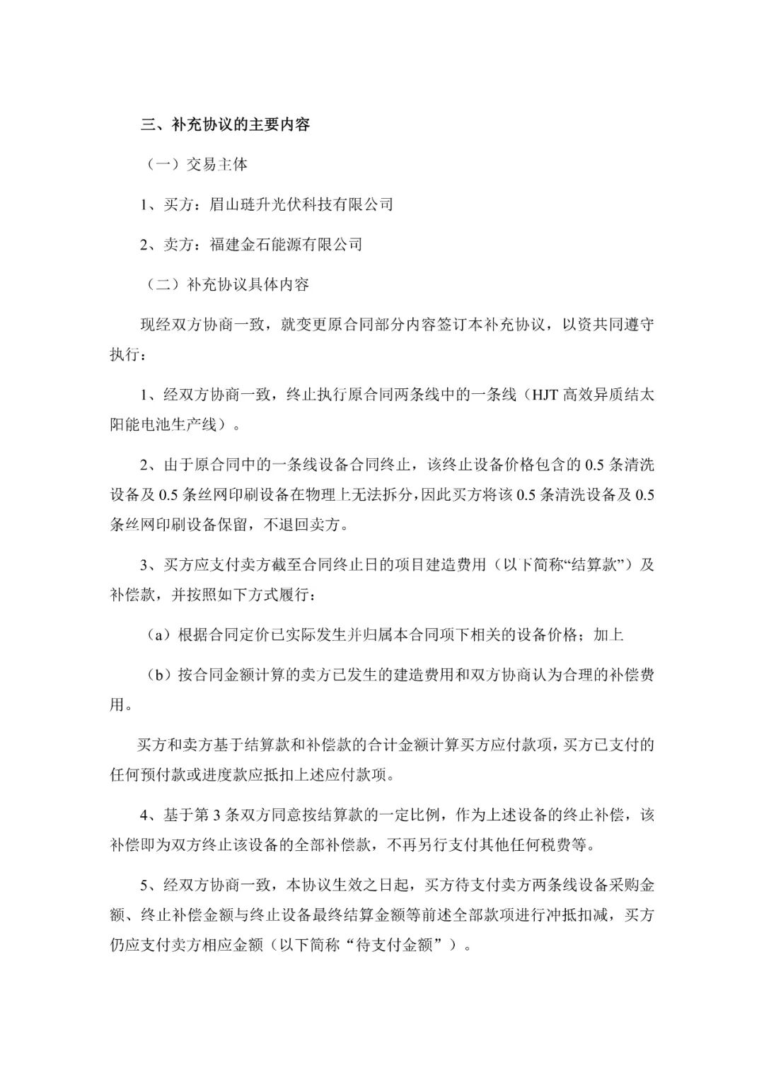 2023年,眉山琏升向金石能源购买高效异质结(HJT)太阳能电池生产线2条,产能为1GW/条,共计2GW。自2023年以来,光伏行业的发展变化较大,经眉山琏升与金石能源协商一致,双方签订了《设备采购合同》补充协议,对原合同部分内容进行变更,并约定其中1条HJT高效异质结太阳能电池生产线设备的采购终止执行。