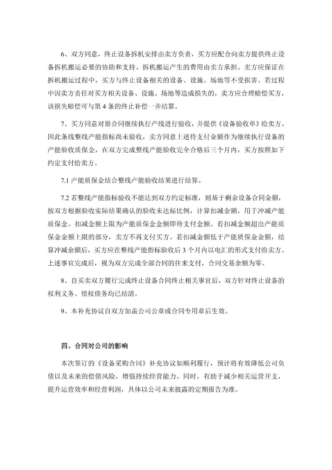 值得注意的是,由于原合同中的一条线设备合同终止,该终止设备价格包含的0.5条清洗设备及0.5条丝网印刷设备在物理上无法拆分,因此买方将该0.5条清洗设备及0.5条丝网印刷设备保留,不退回卖方。