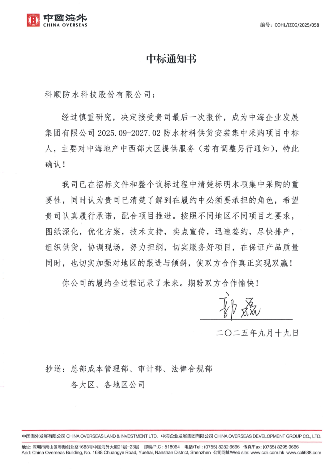 凭借卓越的产品品质与专业的服务能力,科顺股份成功中标防水材料供货安装集中采购项目,正式成为中海集团战略合作伙伴。