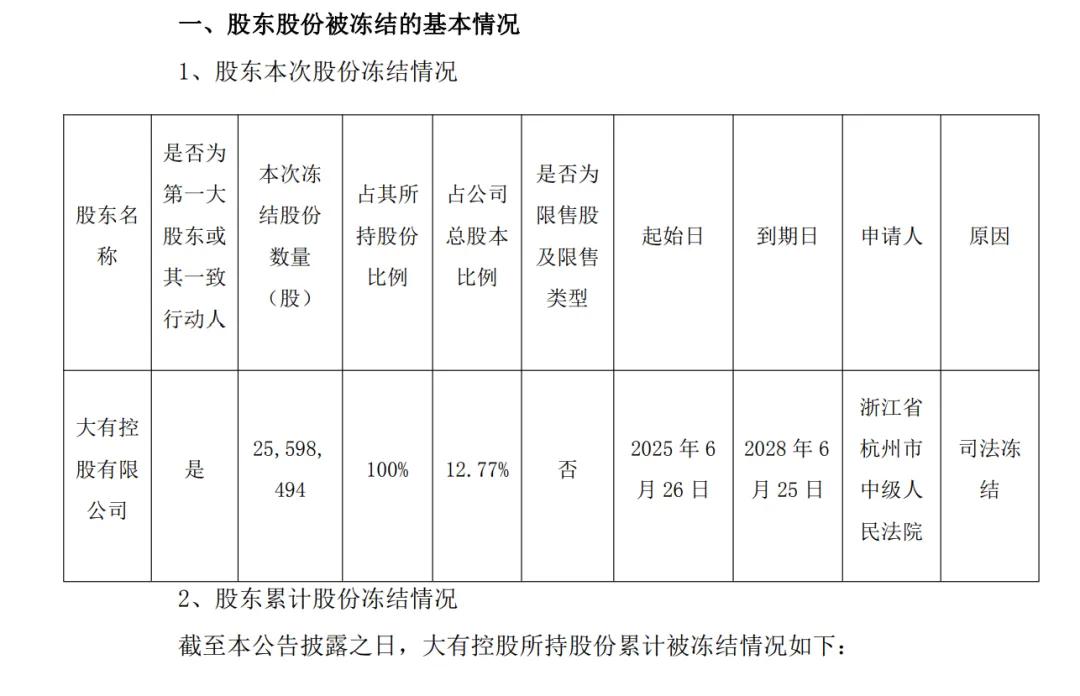 公司于2025年8月26日披露了《关于控股股东股份被司法冻结的公告》(公告编号:2025-051),公告内容为公司控股股东大有控股有限公司(以下简称“大有控股”)持有的本公司股份被冻结。公司于今日收到大有控股的《关于股份冻结事宜的告知函》及转达浙江省杭州市中级人民法院出具的《民事裁定书》,现将有关本次冻结情况的进展公告如下: