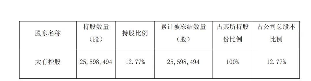 1、截至本公告披露之日,大有控股累计冻结25,598,494股,占其所持有公司股份的比例为100%,占公司总股本的比例为12.77%。若已被司法冻结的股份后续被法院强制执行,是否会导致公司控制权发生变更将存在较大不确定性。该事项暂时不会对公司生产经营、公司治理产生影响。