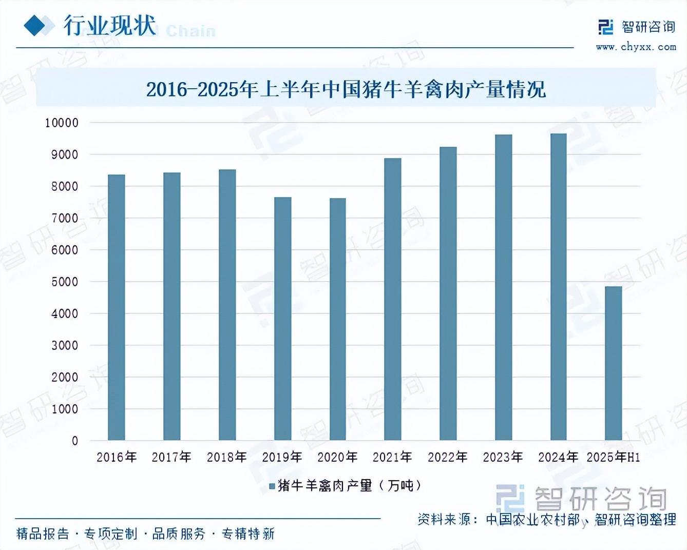 胶原蛋白作为动物源性蛋白,其原料主要来源于猪、牛、禽类的皮肤、骨骼及结缔组织。2025年上半年,中国猪牛羊禽肉产量为4843万吨,同比增长2.78%。随着肉类产量的增加,可用于提取胶原蛋白的原材料也相应增多。这为胶原蛋白食品生产企业提供了更充足的原料供应,有助于降低原材料采购成本,提高生产效率。例如,猪皮、牛皮、鸡爪等富含胶原蛋白的部位,是生产胶原蛋白肽、胶原蛋白软糖等食品的主要原料。产量的增加意味着这些原料的供应更加稳定,企业可以更灵活地调整生产计划,满足市场需求。