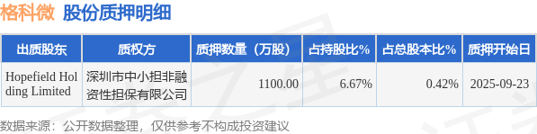证券之星消息,格科微(688728)9月24日公开信息显示,股东Hopefield Holding Limited向深圳市中小担非融资性担保有限公司合计质押1100.0万股,占总股本0.42%。质押详情见下表: