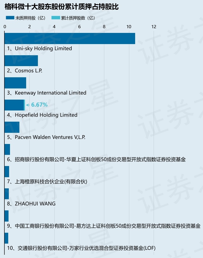 截止本公告日,股东Hopefield Holding Limited已累计质押股份1100.0万股,占其持股总数的6.67%。本次质押后格科微十大股东的累计质押股份占持股比例(占持股比例的计算以公司最新一期财务报表公布的十大股东的持股总数为基准)见下图: