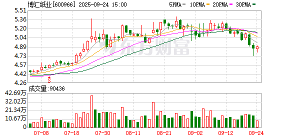 博汇纸业9月24日大宗交易平台出现一笔成交,成交量3318.77万股,成交金额1.62亿元,大宗交易成交价为4.89元。该笔交易的买方营业部为国泰海通证券股份有限公司上海黄浦区中山南路证券营业部,卖方营业部为国泰海通证券股份有限公司上海闵行区号文路证券营业部。