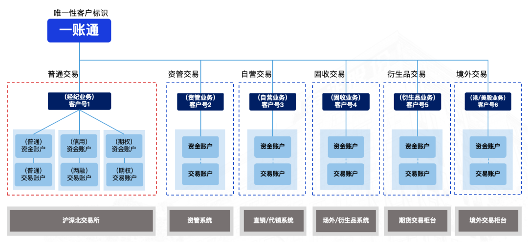 以客户为中心,横向拉通经纪、资管、自营、固收、衍生品、境外等业务线条,将一个客户名下的所有账户关联到一个统一的客户ID下,实现跨条线业务办理支持。