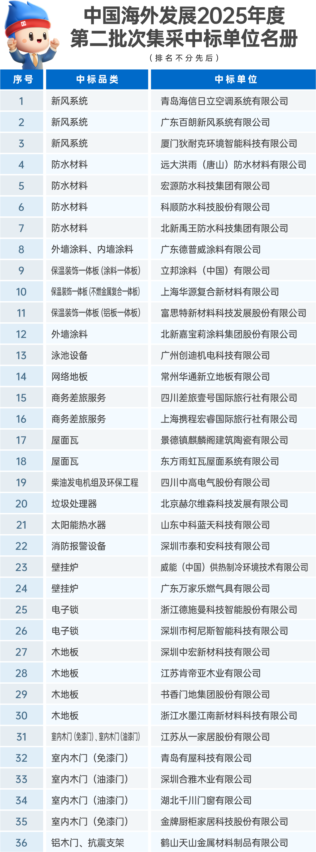 值得注意的是,此次中海地产的集中采购并非局限于防水材料,而是覆盖多个建材品类,形成全产业链采购布局。其中包括新风系统、保温装饰一体板、泳池设备、网络地板、屋面瓦、环保工程等多个品类,共有36家企业成功入围。在新风系统领域,青岛海信日立空调系统有限公司、广东百朗新风系统有限公司、厦门狄耐克环境智能科技有限公司三家企业凭借先进的技术与优质的产品成功中标;屋面瓦品类中,景德镇麒麟阁建筑陶瓷有限公司、东方雨虹瓦屋面系统有限公司中标……
