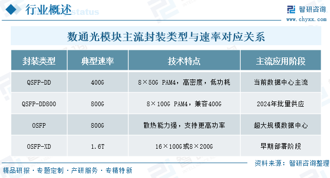数通光模块的封装类型与速率紧密关联,形成了完整的技术矩阵。在400G时代,QSFP-DD凭借小巧尺寸、高密度和低功耗成为主流封装,其向后兼容特性可无缝支持100G到400G的升级,无需更换前面板设计。800G模块则基于QSFP-DD800规格,通过8通道×100G PAM4实现高速传输。与此同时,OSFP封装凭借更强的散热能力和更高功率预算,成为800G及更高速率应用的理想选择,尤其适合高功耗场景。不同封装类型各具优势,共同推动高速光模块的技术演进。