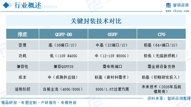 当前主流封装技术中,QSFP-DD凭借高密度(36端口/1U)和低功耗(<10W@400G)优势,成为400G/800G时代的主流选择,尤其适合传统数据中心的平滑升级;OSFP则通过强化散热设计(支持15-20W@800G)在高功率场景展现优势,是AI算力集群过渡期的优选方案;而面向未来的CPO技术通过光电共封装实现超高密度(64+端口/1U)和极低功耗,但需要重构网络架构,预计2026年后在超算中心率先商用。三种技术分别对应兼容性优先(QSFP-DD)、性能优先(OSFP)和革命性突破(CPO)的差异化发展路径。