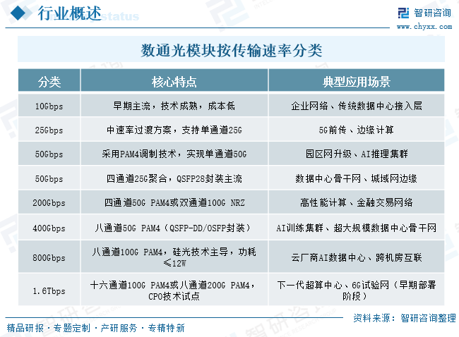 数通光模块的分类体系复杂,主要依据速率、封装、波长、传输距离等维度展开。其中,封装形式和传输速率是其两大主要分类维度。这两大维度共同决定了光模块的性能特点和应用场景。速率分类方面,数通光模块已经形成了从10G、25G、50G到100G、200G、400G、800G乃至1.6T的完整产品梯队。目前行业正处于800G需求强劲增长与1.6T开始早期部署的过渡阶段,部分超大规模数据中心已开始试用1.6T光模块,但整体市场仍处于发展初期。