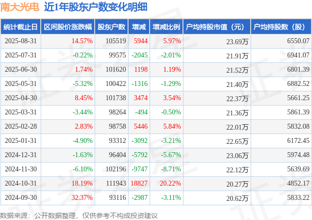 从股价来看,2025年7月31日至2025年8月31日,南大光电区间涨幅为14.57%,在此期间股东户数增加5944.0户,增幅为5.97%。