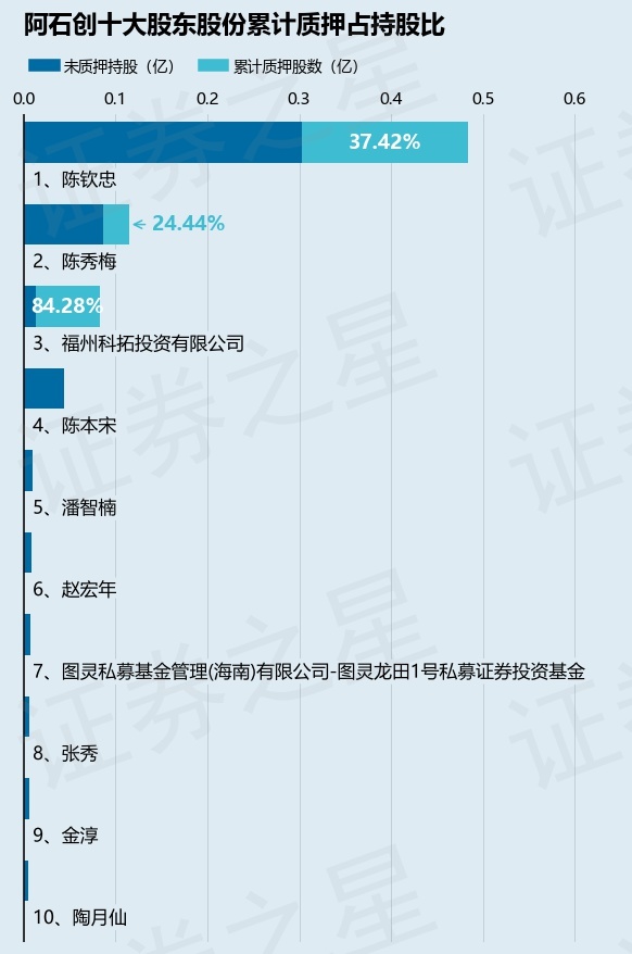 截止本公告日,股东陈钦忠已累计质押股份1808.0万股,占其持股总数的37.42%,股东陈秀梅已累计质押股份280.0万股,占其持股总数的24.44%,股东福州科拓投资有限公司已累计质押股份700.0万股,占其持股总数的84.28%。本次质押后阿石创十大股东的累计质押股份占持股比例(占持股比例的计算以公司最新一期财务报表公布的十大股东的持股总数为基准)见下图: