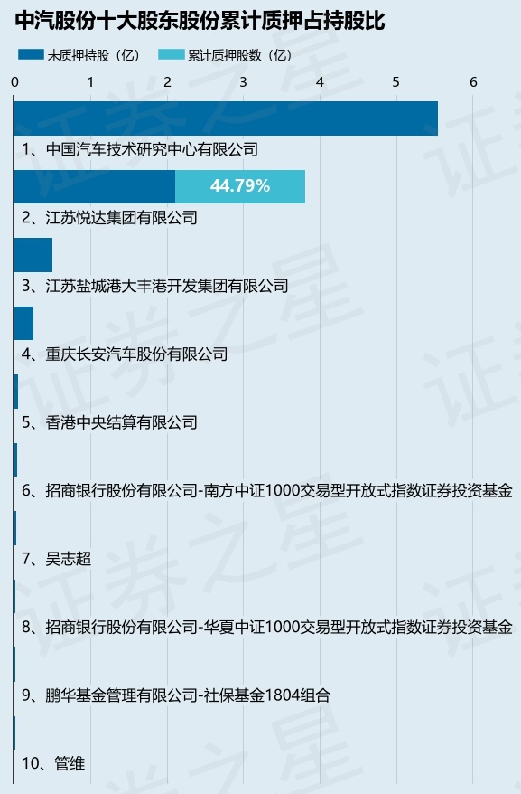 截止本公告日,股东江苏悦达集团有限公司已累计质押股份1.71亿股,占其持股总数的44.79%。本次质押后中汽股份十大股东的累计质押股份占持股比例(占持股比例的计算以公司最新一期财务报表公布的十大股东的持股总数为基准)见下图: