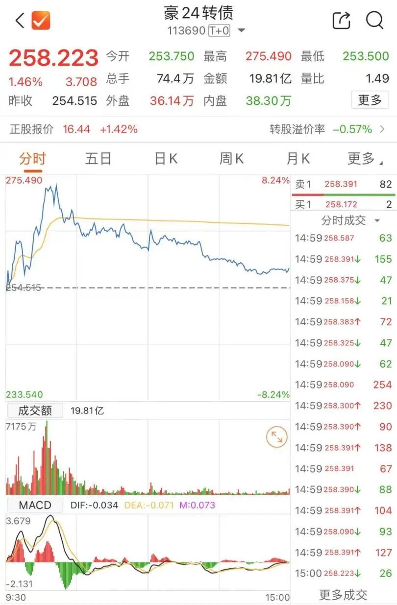 截至9月26日收盘,豪24转债价格为258.223元/张。对照100.1945元/张的强赎价格,投资者若是不及时交易或转股而被强制赎回,或将亏损超61%,截至目前,豪24转债仍有0.52亿元余额尚未完成交易或转股,所占比例超过9%。