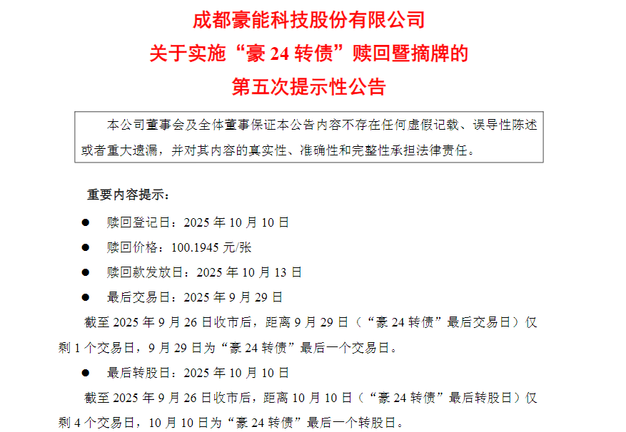 豪能股份(维权)近日发布关于实施“豪24转债”赎回暨摘牌的第五次提示性公告,提醒投资者9月29日为豪24转债最后一个交易日,10月10日是最后一个转股日,债券持有人应及时卖出或转股。10月10日收市后,未实施转股的豪24转债将全部冻结,停止交易和转股。