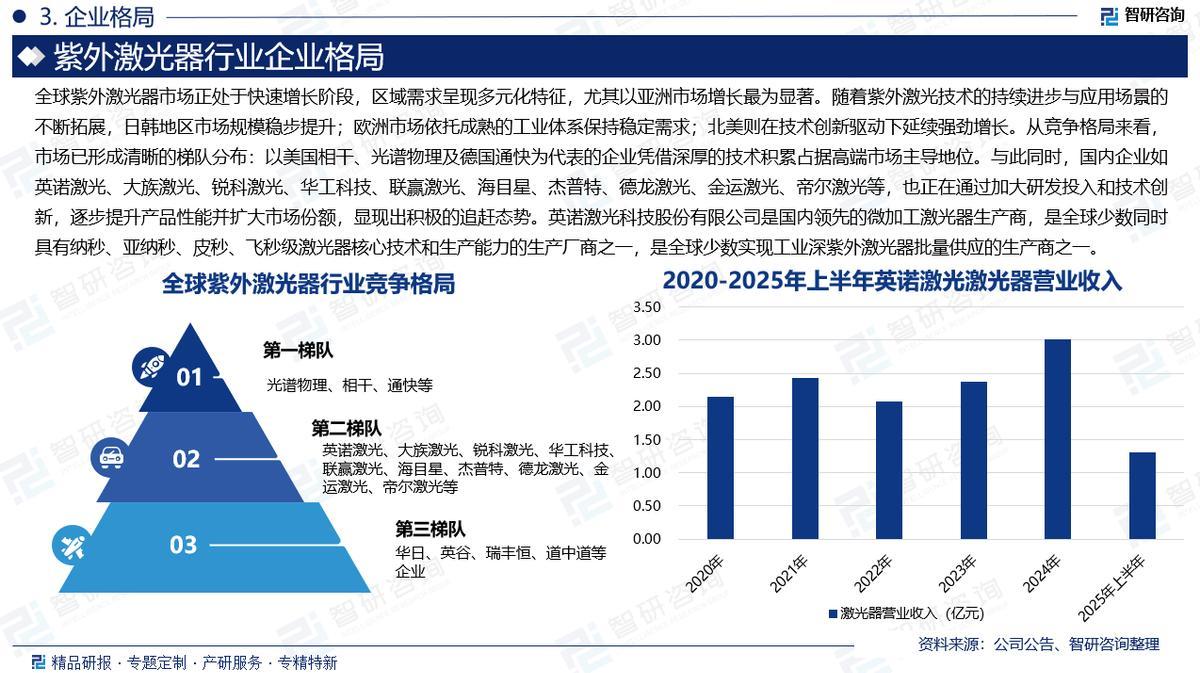 企业格局:全球紫外激光器市场正处于快速增长阶段,区域需求呈现多元化特征,尤其以亚洲市场增长最为显著。随着紫外激光技术的持续进步与应用场景的不断拓展,日韩地区市场规模稳步提升;欧洲市场依托成熟的工业体系保持稳定需求;北美则在技术创新驱动下延续强劲增长。从竞争格局来看,市场已形成清晰的梯队分布:以美国相干、光谱物理及德国通快为代表的企业凭借深厚的技术积累占据高端市场主导地位。与此同时,国内企业如英诺激光、大族激光、锐科激光、华工科技、联赢激光、海目星、杰普特、德龙激光、金运激光、帝尔激光等,也正在通过加大研发投入和技术创新,逐步提升产品性能并扩大市场份额,显现出积极的追赶态势。
