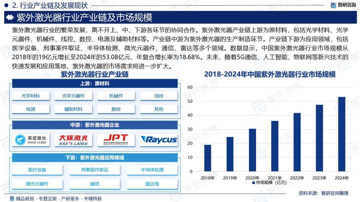 市场规模:随着制造业向高端化、精密化方向加速转型,紫外激光器凭借其优异的加工精度和能量控制特性,在半导体、消费电子及生物医疗等高科技领域的应用需求呈现快速增长态势。特别是在半导体制造领域,随着器件特征尺寸持续微缩至纳米级,对制造工艺的精度和能效要求日益严苛,紫外激光器因其独特的短波长优势,在晶圆检测、精密切割、微细加工等关键工艺环节发挥着不可替代的作用,成为推动半导体产业技术进步的重要支撑技术。数据显示,中国紫外激光器行业市场规模从2018年的19亿元增长至2024年的53.08亿元,年复合增长率为18.68%。未来,随着5G通信、人工智能、物联网等新兴技术的快速发展和应用落地,紫外激光器的市场需求将进一步扩大。