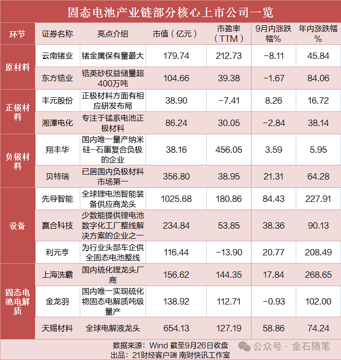 21财经统计的固态电池产业链上市公司:天赐等受益本次研究最大。