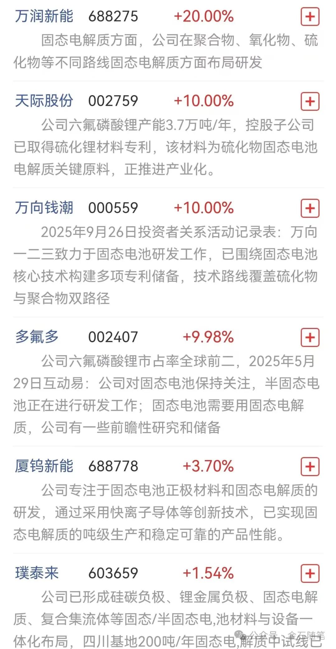9月29日,固态电池大爆发,储能尤其固态电池相关产业链上演暴涨行情。其中,锂电电解液概念涨6.67%,正极涨5.74%,六氟磷酸锂、磷酸铁锂、光伏逆变器等储能概念全面涨超4%。