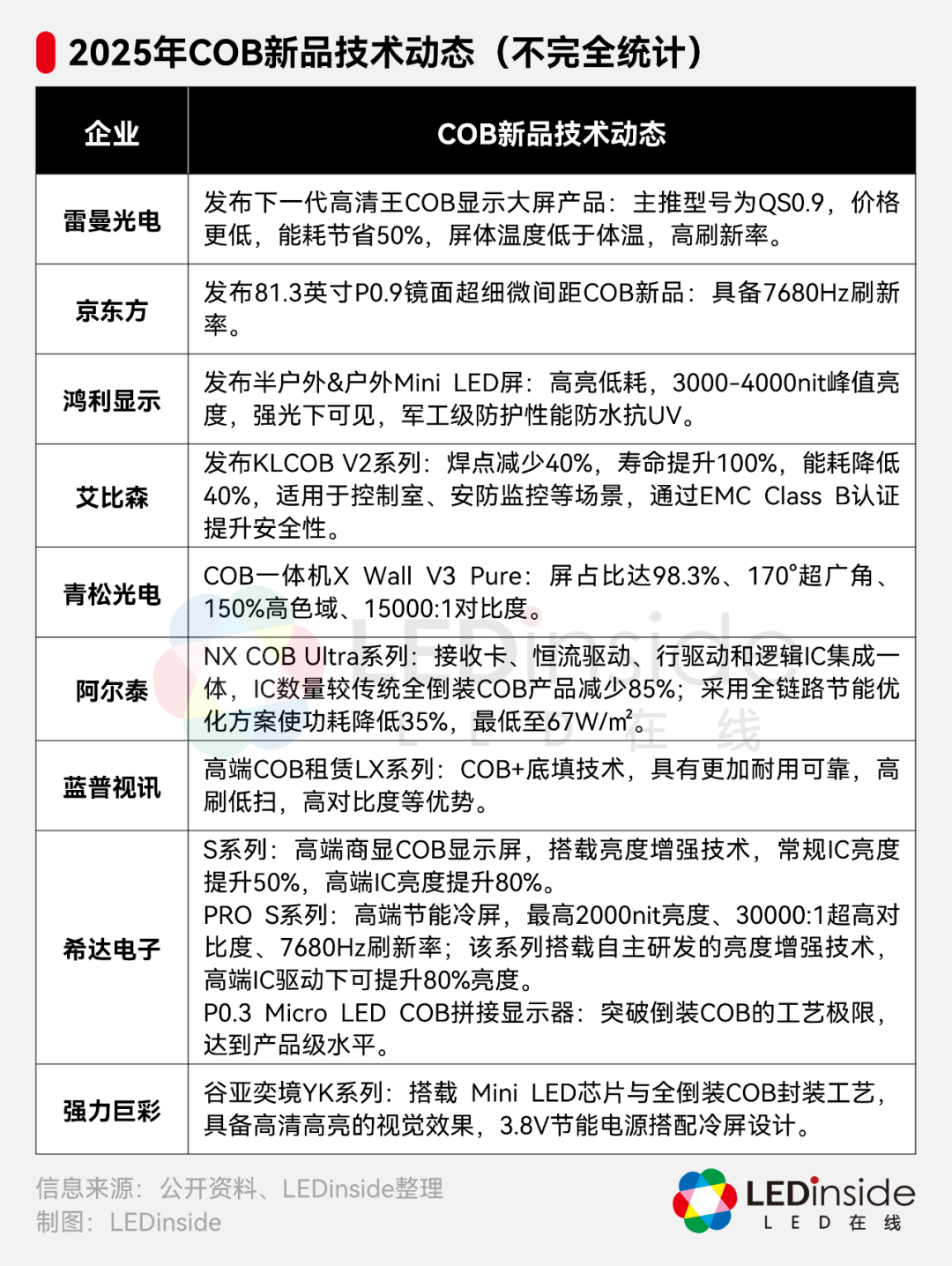 从2025年新品情况来看,COB LED显示屏的发展趋势主要体现在技术创新、应用拓展、性能提升和成本优化等方面。