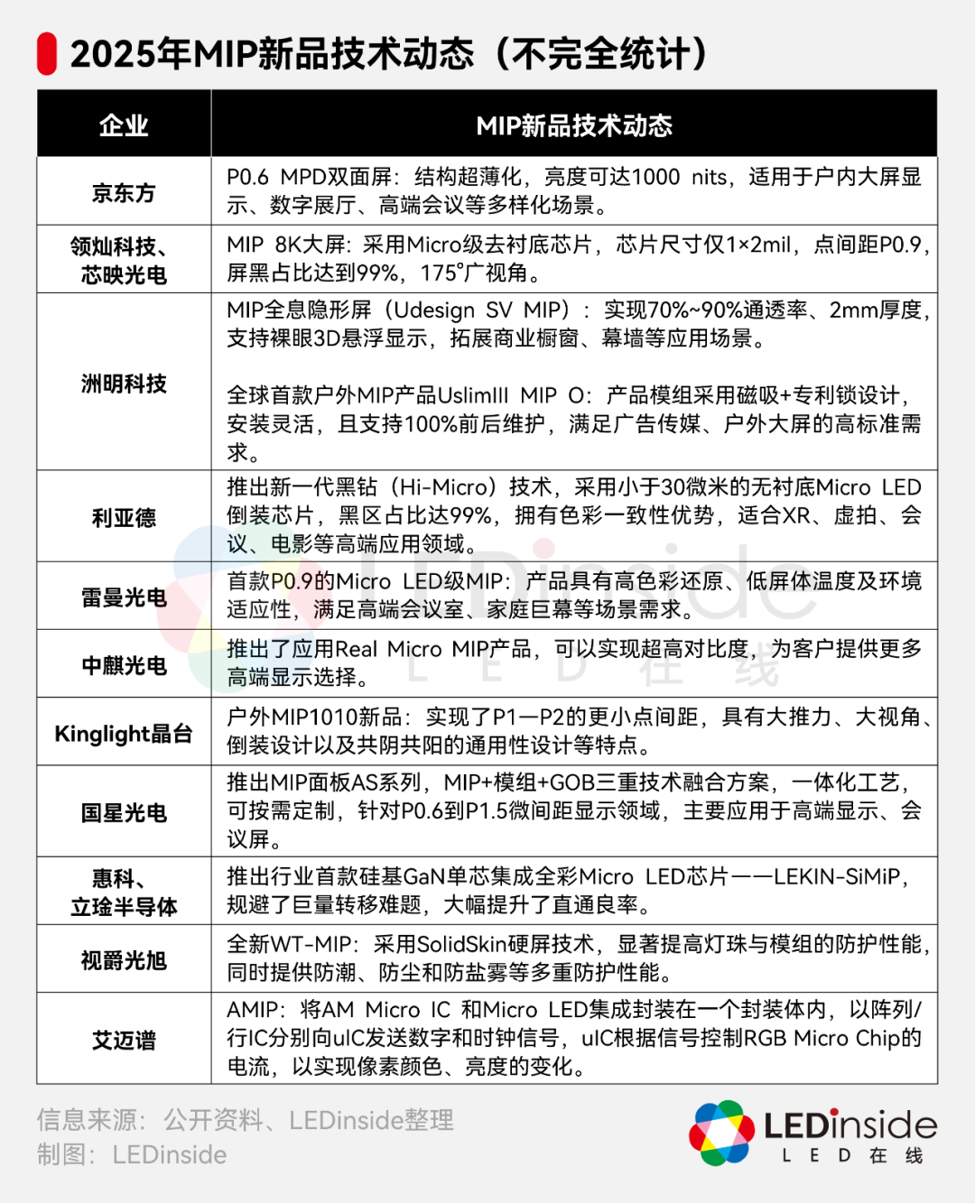 2025年MIP技术也在积极发展当中,意图追赶上COB高速发展进程。