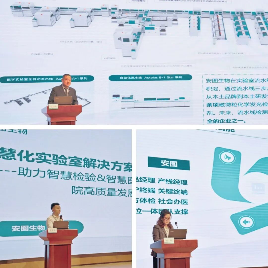 在专题分享环节,安图生物多位业务负责人围绕产品技术、市场趋势与合作模式进行了深度解析。赵虹云经理以“智联生态 全域赋能”为题,从产品性能切入介绍全系列产品线,展现安图生物技术布局与产品协同的综合实力;孔强正经理围绕 “智慧化实验室助力医院高质量发展”,从政策导向、行业趋势、医院建设需求等多维度,阐述了实验室智慧化的重要性,并结合多方案例分析分析了智慧化实验室建设方案在支撑智慧医院建设、推动检验学科发展、助力政府区域医学检验中心建设等方面的实际应用价值;白珏经理则聚焦“新渠道合作模式及报单规则”解读,详细介绍了安图生物在渠道管理上的创新举措与支持政策,并现场演示“安图渠道通”小程序,通过数字化工具提升报单效率与商机透明度。