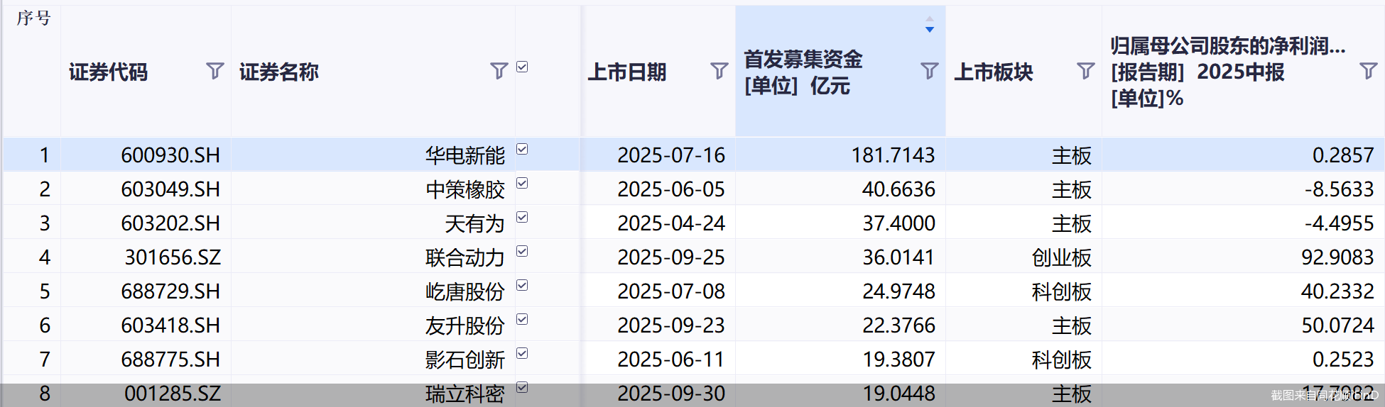 经同花顺iFinD统计,前三季度首发募资额位列第三、第四、第五位的新股分别系天有为、联合动力、屹唐股份,对应首发募集资金分别约为37.4亿元、36.01亿元、24.97亿元。