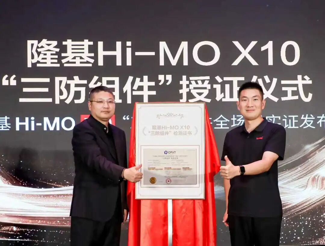 发布会上,国家光伏质检中心(CPVT)副主任朱晓岗代表CPVT为隆基Hi-MO X10授予“三防”组件检测证书,这是行业首个“三防组件”的权威测试,旨在证明“三防”组件所具备的卓越性能,对促进行业技术进步和高质量发展具有重要意义。