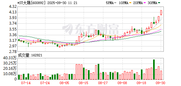 *ST大晟再度涨停,5个交易日内录得3个涨停,累计涨幅为16.43%,累计换手率为21.42%。截至10:34,该股今日成交量1588.58万股,成交金额6547.67万元,换手率2.84%。最新A股总市值达23.39亿元,A股流通市值23.38亿元。