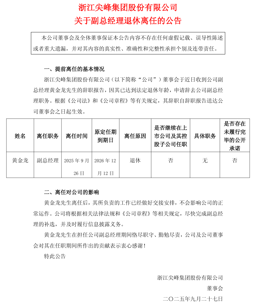 近日,尖峰集团公告,副总经理黄金龙因达到法定退休年龄,于2025年9月26日提交辞职报告,其辞职自报告送达公司董事会之日起生效。黄金龙先生原定任期至2026年12月12日。公司计划按照相关规定尽快完成新副总经理的补选。