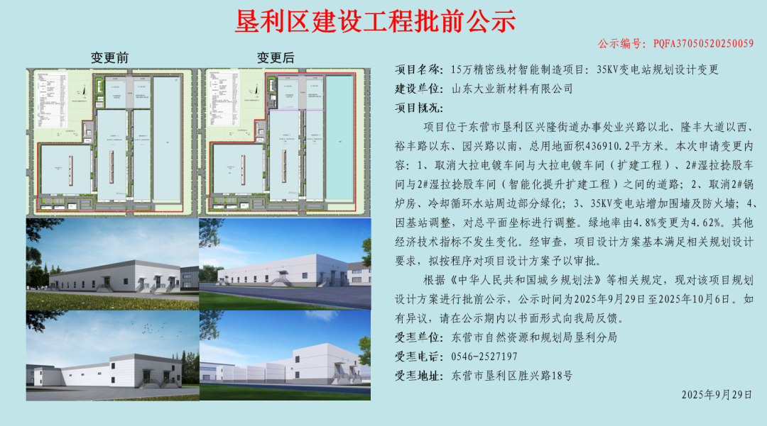 近日,东营市垦利区自然资源和规划局发布公示,山东大业新材料有限公司15万精密线材智能制造项目的35KV变电站规划设计变更进入批前公示阶段。作为全球胎圈钢丝生产能力第一、钢帘线生产能力全球第三的企业,此次规划变更将进一步优化其智能制造布局,为轮胎产业链提供更高质量的原材料支持。