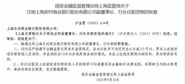 中国网财经10月9日讯近日,国家金融监督管理总局上海监管局发布批复显示,核准汪明上海农村商业银行股份有限公司副董事长、行长的任职资格。