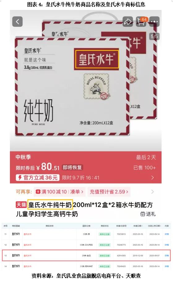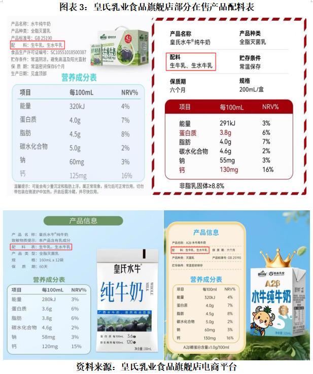 皇氏乳业食品旗舰店销售的多款“皇氏水牛纯牛奶”产品配料均标示为“生牛乳、生水牛乳”,但实际上“皇氏水牛”仅是注册商标,产品本质是添加了生水牛乳的“纯牛奶”。
