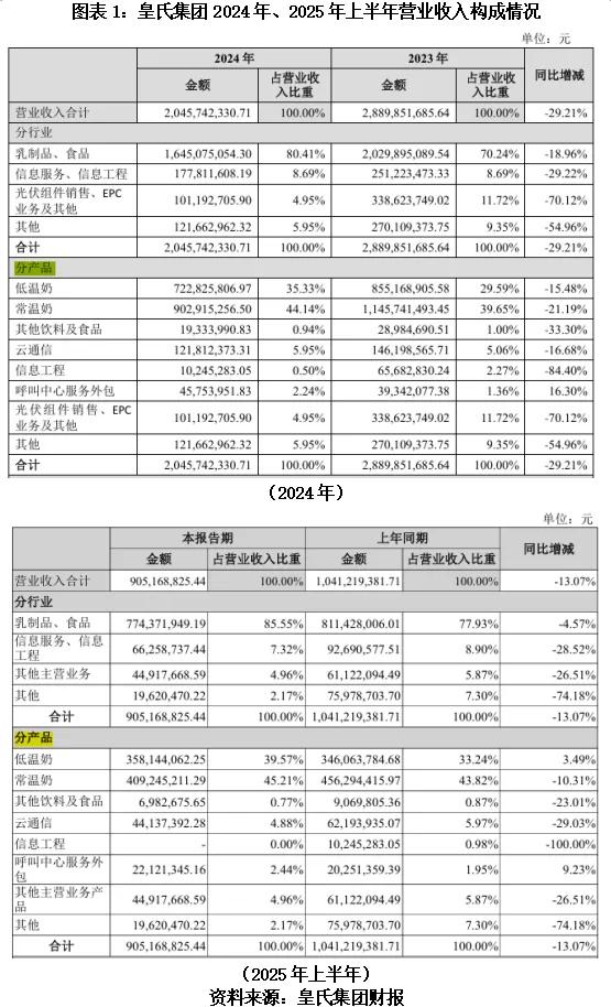 2025年半年报显示,皇氏集团的特色乳品业务表现亦不容乐观,如图表1所示,从分产品2025年上半年的收入表现看,除了低温奶同比微增3.49%,常温奶、其他饮料及食品分别同比下滑10.31%、23.01%。