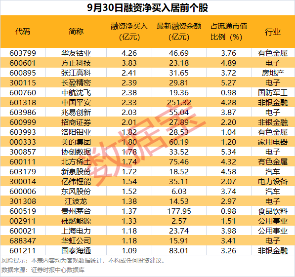 具体到个股,9月30日获融资净买入千万元以上的有278只,其中21只融资净买入额超亿元。华友钴业融资净买入额居首,当日净买入4.26亿元;其次是方正科技、张江高科,融资净买入金额分别为3.83亿元、2.41亿元;融资净买入金额居前的还有长盈精密、中航沈飞、中国平安等。