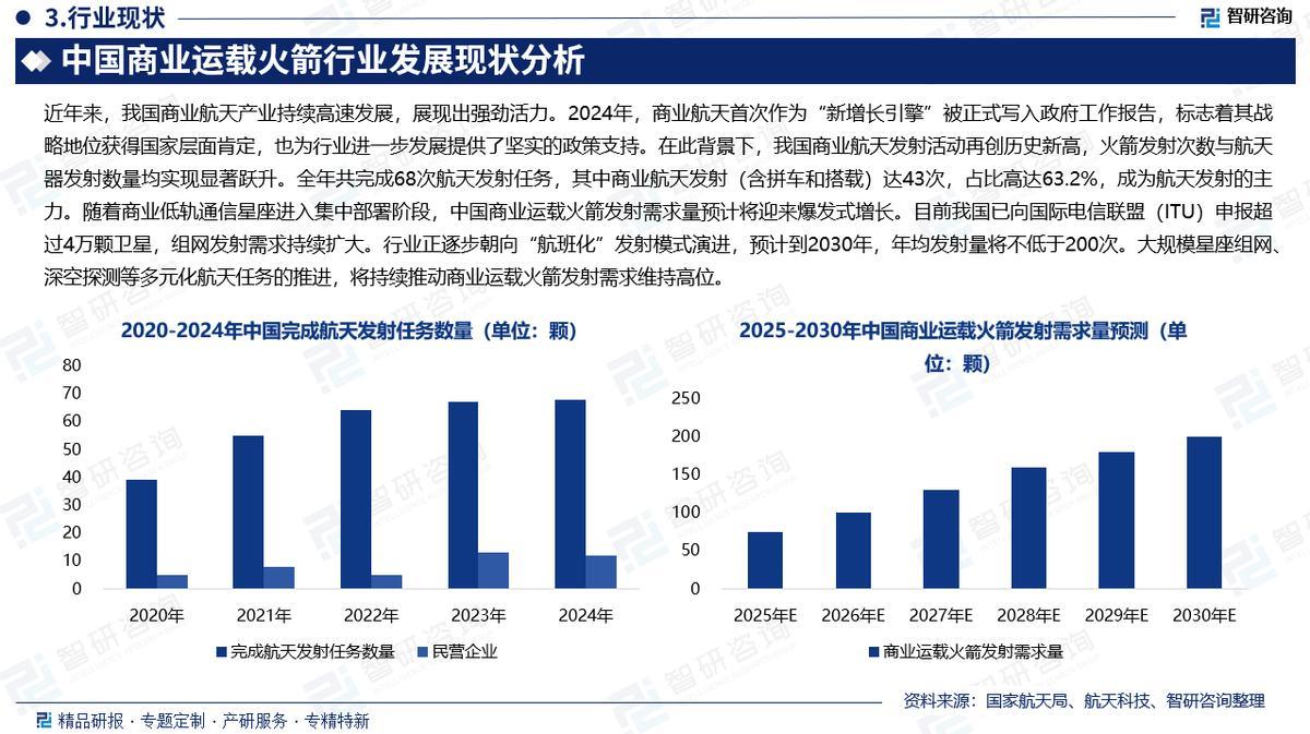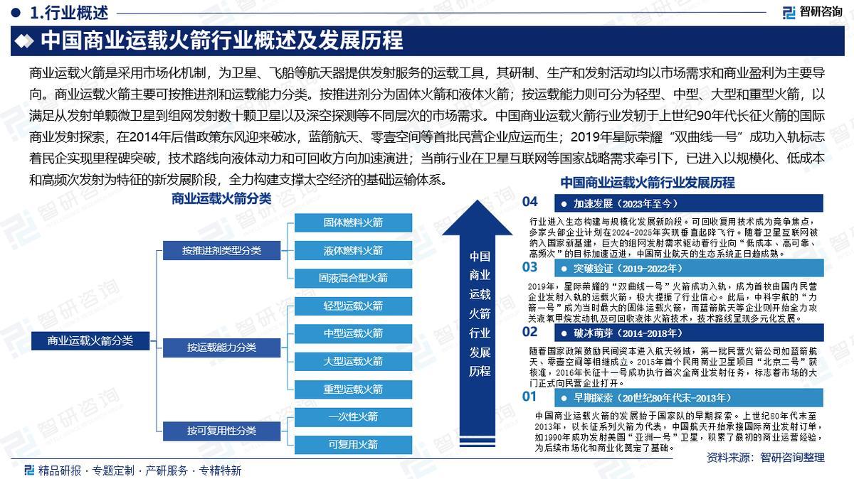 行业概述:商业运载火箭是采用市场化机制,为卫星、飞船等航天器提供发射服务的运载工具,其研制、生产和发射活动均以市场需求和商业盈利为主要导向。根据国家国防科工局及军委装备发展部联合发布的《关于促进商业运载火箭规范有序发展的通知》,商业发射的定义为企业通过自有资金、社会资本或合资合营等模式,按照国家安全监管要求和市场运作机制,实施的运载火箭相关研制生产及以盈利为目的的航天发射等行为。