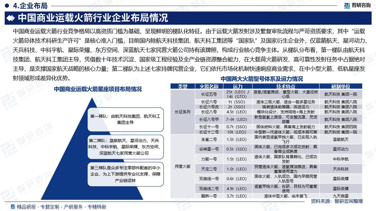 竞争格局:中国商业运载火箭行业竞争格局以高资质门槛为基础,呈现鲜明的梯队化特征。由于运载火箭发射涉及繁复审批流程与严苛资质要求,其中“运载火箭总体技术科研生产许可”是核心准入门槛,目前国内除航天科技集团、航天科工集团等“国家队”及国家衍生企业外,仅蓝箭航天、星河动力、天兵科技、中科宇航、星际荣耀、东方空间、深蓝航天七家民营火箭公司持有该牌照,构成行业核心竞争主体。从梯队分布看,第一梯队由航天科技集团、航天科工集团主导,凭借数十年技术沉淀、国家级工程经验及全产业链资源整合能力,在大载荷火箭研发、高可靠性发射任务(如空间站建设、深空探测)中占据绝对主导,是支撑国家航天战略的核心力量;第二梯队为上述七家持牌民营企业,它们依托市场化机制快速响应商业需求,在中小型火箭、低轨星座发射领域形成差异化优势——如星河动力“谷神星一号”高频次发射、蓝箭航天“朱雀二号”液氧甲烷技术突破、中科宇航“力箭一号”开拓国际市场,成为推动商业航天规模化发展的关键增长极,两类主体既分工互补又适度竞争,共同塑造了行业多元发展格局。