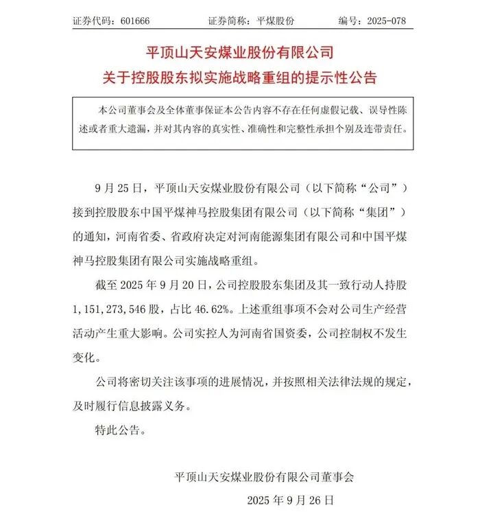 2025年9月25日晚,平煤股份公告称,公司当日接到控股股东中国平煤神马控股集团有限公司的通知,河南省委、省政府决定对河南能源集团有限公司和中国平煤神马控股集团有限公司实施战略重组。